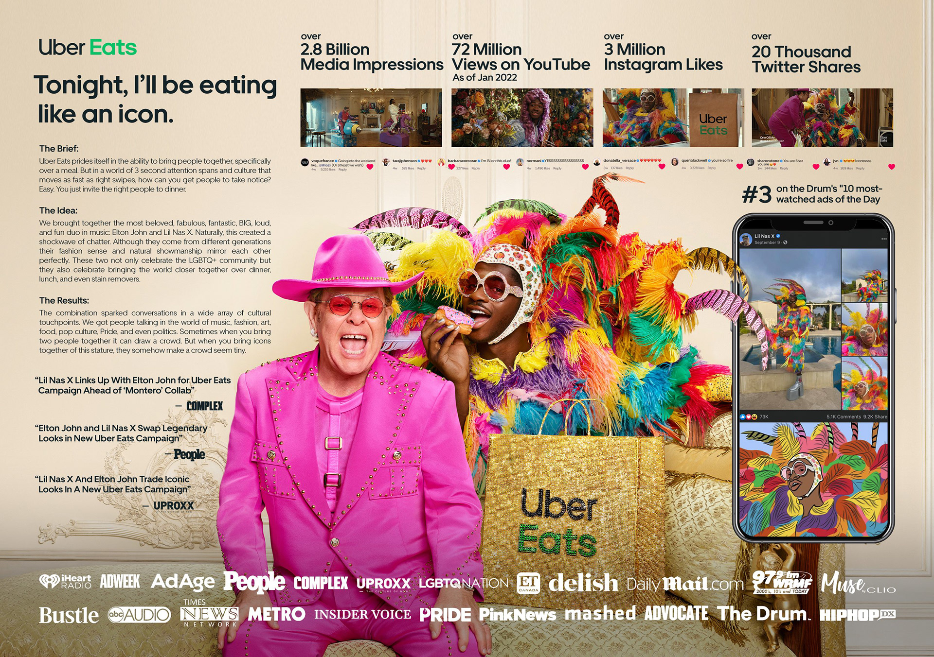 As An Art director Intern with Special Group US, I was asked to come up with over 200+ celebrity duos. I paired Elton John with Lil Nas X, the most colorful duo Uber Eats has ever seen.